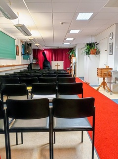 Seurakunnantiloissa on pyhäkouluhuone ja pieni kahviotila.